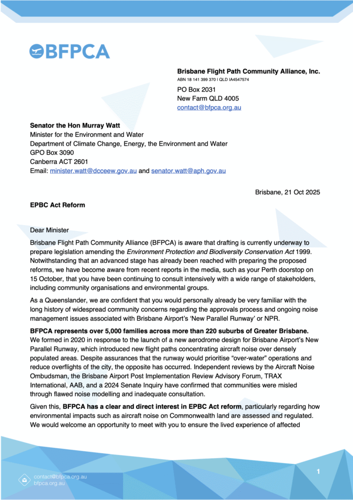 Brisbane Flight Path Community Alliance (BFPCA) has written to the Federal Minister for the Environment and Water, Senator the Hon Murray Watt, calling for critical changes to the Government’s proposed reforms to the Environment Protection and Biodiversity Conservation Act 1999 (EPBC Act).